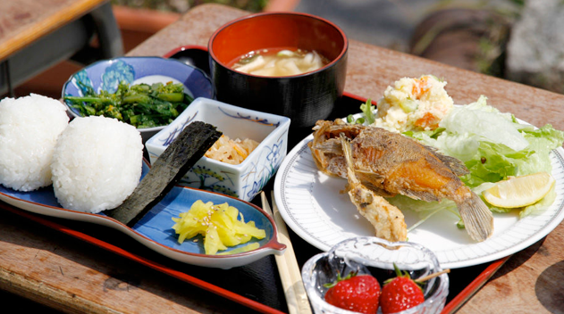 席数は25席ほど。そんなこまめ食堂をオススメしてくれたのはデュアルスポーツスタッフのHari。おにぎり定食がオススメですよ、とのことでしたが、取材時はすでに3件目。じつはグルメ隊全員お腹いっぱい。今回はおにぎり定食を泣く泣くあきらめました。そのかわり写真だけ